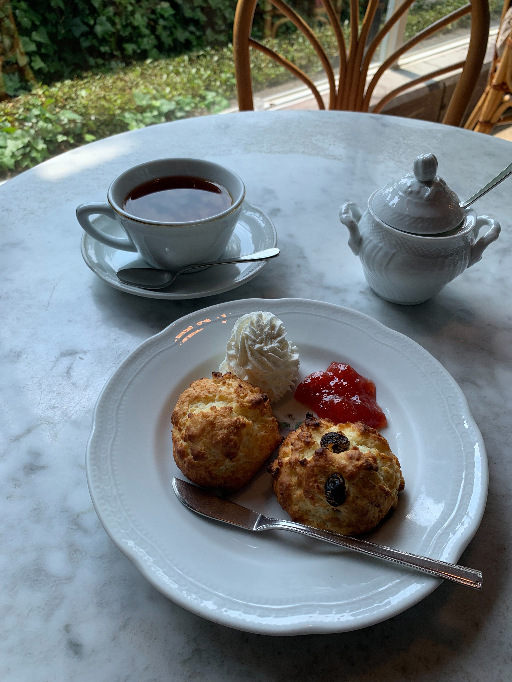 早餐提供的司康饼外脆里香,配有奶油与果酱。搭配红茶也只需几百日元,能够享受到如此幸福的早餐不禁心怀感激。而不久前我又第一次来这里吃了午餐,在阳光房开敞的氛围中,享用到了正统的西式套餐与百威啤酒。